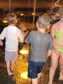 Just when we thought the day was coming to an end . . . 9:00 pm Joe decides he's going to run through the water fountains without getting wet . . . As you can tell by the pix, he got wet. So wet that I had to go into the Dinsey store and go buy a Mickey Mouse towell for $22.95. And won't you know the towels are specifically placed right in front of the enterance next to the fountains. The good news was that I was not the first to have to buy a $23 towel.